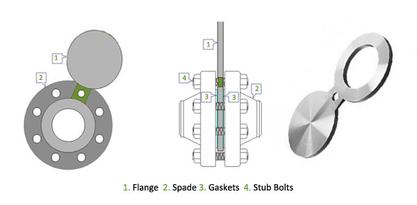 This is a flange plate which as its name implies is shaped like a pair of spectacles only in this case one spectacle is open and the other is blanked off. This plate is installed in the pipeline between a pair of flanges. In normal operation the plate is installed with the open side in the pipeline so it does not restrict the flow. However, once the pressure has been taken off the flange plates can be loosened and the spectacle plate changed to put the blind side in the flow. This will completely seal off the flow making the line safe to work on.
