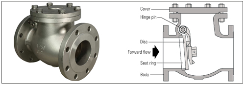 A basic swing Check valve consists of a valve body, a bonnet, and a disk that is connected to a hinge. The disk swings away from the valve-seat to allow flow in the forward direction, and returns to valve-seat when upstream flow is stopped, to prevent back flow. The disc in a swing type Check valve is unguided as it fully opens or closes. There are many disk and seat designs available, in order to meet the requirements of different applications. The valve allows full, unobstructed flow and automatically closes as pressure decreases. These valves are fully closed when flow reaches zero, in order to prevent back flow. Turbulence and pressure drop in the valve are very low.