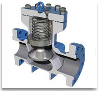A basic check valve consists of a valve body, bonnet or cover, and a disc which is attached to a hinge and swings away from the valve seat to allow fluid to flow in the forward direction, as in a swing- or tilting-disc check valve, and returns to valve seat when upstream flow is stopped. Thus, reverse flow is prevented. In folding disc check valves, the disc consists of two halves attached in the middle. The two halves fold backward when upstream flow is initiated. Activated by a spring, the two halves quickly close the flow path when upstream flow ceases. In the case of lift-check valves, the disc is in the form of a piston which is moved out of the flow path by upstream flow and returns to the valve seat by gravity to stop back flow. Ball-check valves have a disc in the form of a ball.